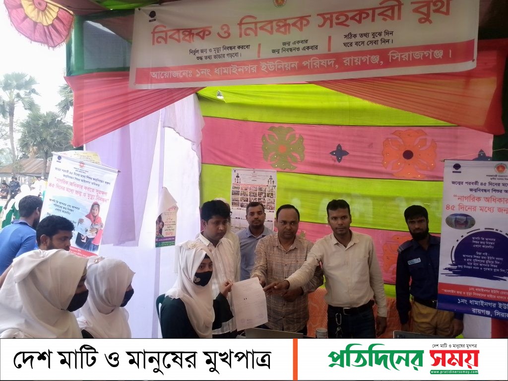 Thank you for reading this post, don't forget to subscribe!১৭ মার্চ, জাতির পিতা বঙ্গবন্ধু শেখ মুজিবুর রহমানের জন্মদিন। এ দিনটি ‘জাতীয় শিশু দিবস’ হিসেবেও পালন করা হয়। প্রতি বছরের মতো এবারও সারাদেশে শিশুদের নিয়ে নানা আয়োজনে পালন করা হচ্ছে দিবসটি, সরকারি-বেসরকারি পর্যায়ে নেওয়া হয়েছে বিভিন্ন কর্মসূচি।দিনটিতে সাধারণ ছুটির পাশাপাশি এর তাৎপর্য তুলে ধরে সিরাজগঞ্জের রায়গঞ্জে দিবসটি পালনে ভিন্ন এক আয়োজন করেছে উপজেলার ধামাইনগর ইউনিয়ন পরিষদ। দিনটিতে গনপ্রজাতন্ত্রী জননেত্রী শেখ হাসিনার শতভাগ জন্ম ও মৃত্যু নিবন্ধন কার্যক্রম সম্পন্ন করার লক্ষে এই ইউনিয়ন পরিষদের উদ্যোগে জন্ম ও মৃত্যু নিবন্ধন মেলা,ক্রীড়া প্রতিযোগিতা,আলোচনা সভা ও সাংস্কৃতিক অনুষ্ঠানের আয়োজন করা হয়েছে। ব্যতিক্রম এই মেলায় ইউনিয়নের বাসিন্দারা এসে তথ্য দিয়ে সহযোগিতা করেই মাত্র ২ দিনেই হাতে হাতে পেয়ে যাচ্ছেন জন্ম ও মৃত্যু নিবন্ধন। মেলায় রয়েছে ৬টি বুথ। বুথে এসে তথ্য দিয়ে একজন নাগরিক খুব সহজেই পাচ্ছেন জন্ম ও মৃত্যু সনদ। ইউনিয়ন পরিষদের চেয়ারম্যানের নির্দেশনায় আর সচিবের কাজের গতিতে গ্রাম পুলিশ আর ইউপি সদস্য মাত্র ২ দিনেই জন্ম ও মৃত্যু নিবন্ধন পৌছে দিচ্ছেন বাড়ি বাড়ি।১ থেকে ৪৫দিন বয়সের শিশুকে জন্ম সনদ প্রদান ও পিতা মাতাকে পুরস্কার প্রদানে এক অনুষ্ঠানের আয়োজন করেন ধামাইনগর ইউনিয়ন পরিষদ।