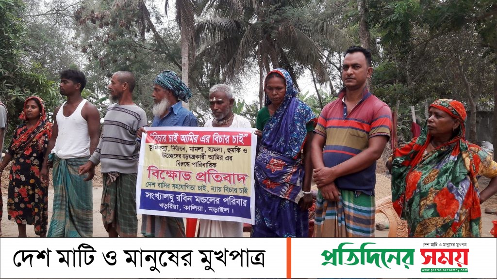 নড়াইলের কালিয়া উপজেলার পেড়লী ইউনিয়নের খড়রিয়া গ্রামে রবিন মন্ডলের (৭০) বসতবাড়ি দখলের অভিযোগ পাওয়া গেছে। এদিকে মিথ্যা মামলা দিয়ে হয়রানির অভিযোগও করেন ভুক্তভোগী পরিবার। এ ঘটনার প্রতিবাদে ভুক্তভোগী পরিবারসহ এলাকাবাসীর আয়োজনে বুধবার (২৬ এপ্রিল) সকাল ৯টার দিকে রবিন মন্ডলের বাড়িতে মানববন্ধন অনুষ্ঠিত হয়েছে।