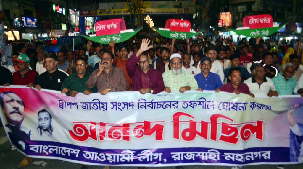 এসএম শফিকুল আলম ইমন, রাজশাহী: দ্বাদশ জাতীয় সংসদ নির্বাচনের তফসিল ঘোষণা করায় রাজশাহী মহানগর আওয়ামী লীগের সাধারণ সম্পাদক ডাবলু সরকারের নেতৃত্বে আনন্দ মিছিল অনুষ্ঠিত হয়েছে।