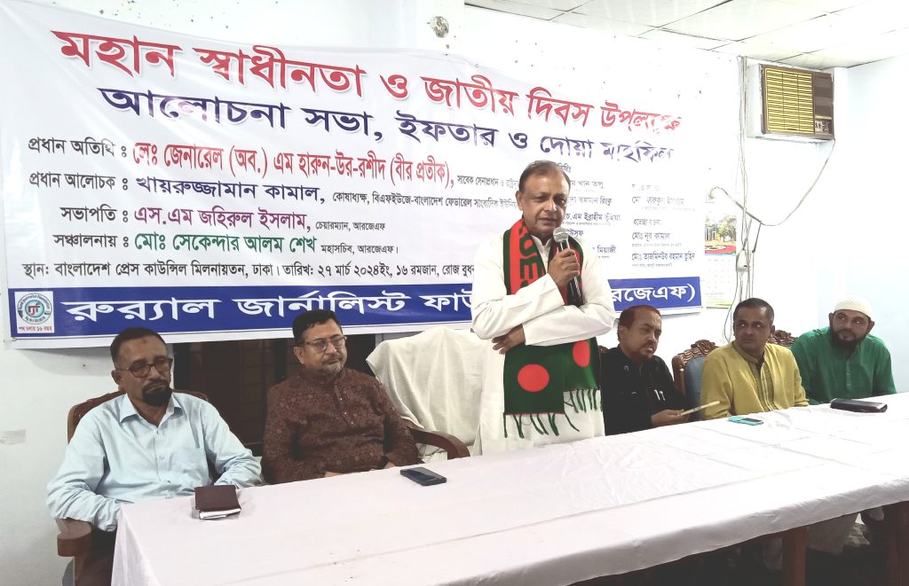 শাহিনুর রহমান সোনা: মহান স্বাধীনতা ও জাতীয় দিবস উপলক্ষে রুরাল জার্নালিস্ট ফাউন্ডেশন (আরজেএফ) এর আয়োজনে আলোচনা সভা, ইফতার ও দোয়া মাহফিল অনুষ্ঠিত হয়েছে। বুধবার (২৭ মার্চ) বিকেলে বাংলাদেশ প্রেস কাউন্সিল মিলনায়তনে আরজেএফ চেয়ারম্যান এসএম জহিরুল ইসলাম'র সভাপতিত্বে ও মহাসচিব সেকেন্দার আলম শেখ'র সঞ্চালনায় প্রধান অতিথি হিসেবে উপস্থিত ছিলেন সাবেক সেনা প্রধান ও রাষ্ট্রদূত লে: জেনারেল (অব.) এম হারুন-উর-রশীদ বীর প্রতীক। প্রধান আলোচক হিসেবে ছিলেন বাংলাদেশ ফেডারেল সাংবাদিক ইউনিয়নের (বিএফইউজে) কোষাধ্যক্ষ খায়রুজ্জামানের কামাল। এসময় বিশেষ অতিথি হিসেবে উপস্থিত ছিলেন সামাজিক পরিবেশ ও মানবাধিকার বাস্তবায়ন সংস্থার চেয়ারম্যান লায়ন এইচএম ইব্রাহীম ভূঁইয়া, হাজী আব্দুল লতিফ ভূঁইয়া বিশ্ববিদ্যালয় কলেজের দাতা সদস্য এসএম আবু তাহের...