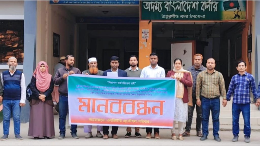 ঠাকুরগাঁও প্রতিনিধি: কুষ্টিয়ার মিরপুর ও সিরাজগঞ্জের রায়গঞ্জ সহ বিভিন্ন উপজেলার স্থানীয় সরকার প্রকৌশলী অধিদপ্তরের উপজেলা প্রকৌশলী ও অন্যান্য কর্মকর্তা-কর্মচারীদের উপর হামলা এবং হুমকি প্রদানের বিরুদ্ধে যথাযথ ব্যবস্থা গ্রহন এবং সার্বিক নিরাপত্তা নিশ্চয়তা প্রদানের দাবিতে ঠাকুরগাঁওয়ে মানববন্ধন করা হয়েছে।