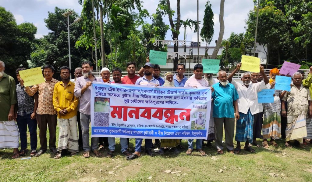 ভূক্তভোগী ক্ষতিগ্রস্থ চাষী ও বীজ বিক্রেতা ঐক্য পরিষদের ব্যানারে মঙ্গলবার (২৬ আগস্ট) দুপুরে ঠাকুরগাঁও প্রেসক্লাবের সামনে  এ মানববন্ধন কর্মসূচি পালন করেন তারা।