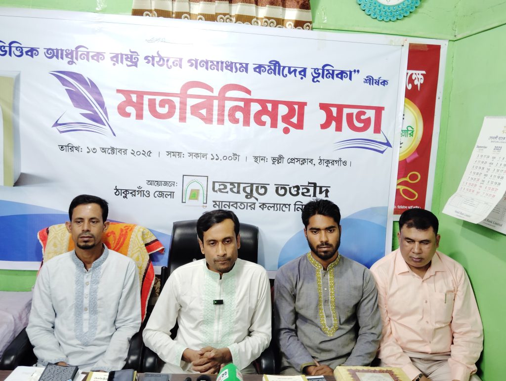ঠাকুরগাঁও জেলা প্রতিনিধিঃ ঠাকুরগাঁও সদর উপজেলার ভূল্লীতে তওহীদভিত্তিক আধুনিক রাষ্ট্র গঠনে গনমাধ্যম কর্মীদের ভূমিকা শীর্ষক মতবিনিময় সভা অনুষ্ঠিত হয়েছে।